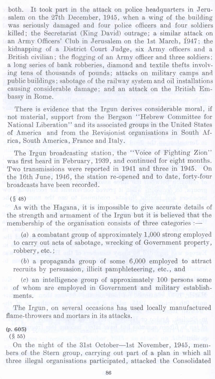 There is evidence that the Irgun derives considerable moral, if not material, support from the Bergson "Hebrew Committee for National Liberation" and its associated groups in the United States of America and from the Revisionist organisations in South Africa, South America, France and Italy.