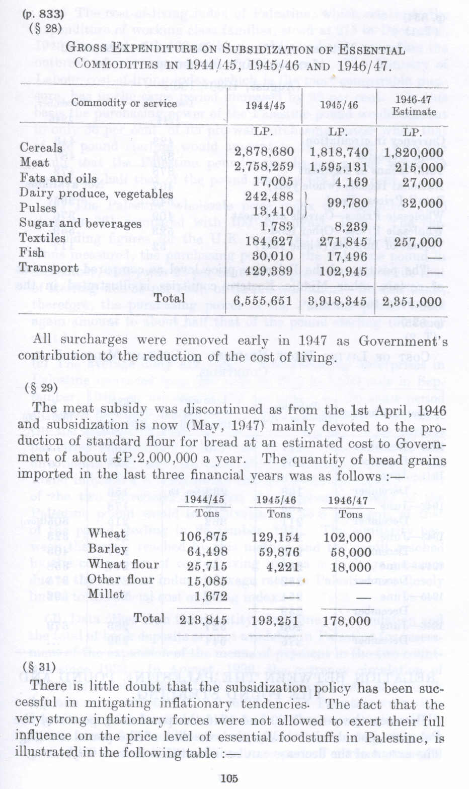 There is little doubt that the subsidization policy has been successful in mitigating inflationary tendencies. The fact that the very strong inflationary forces were not allowed to exert their full influence on the price level of essential foodstuffs in Palestine, is illustrated in the following table :-