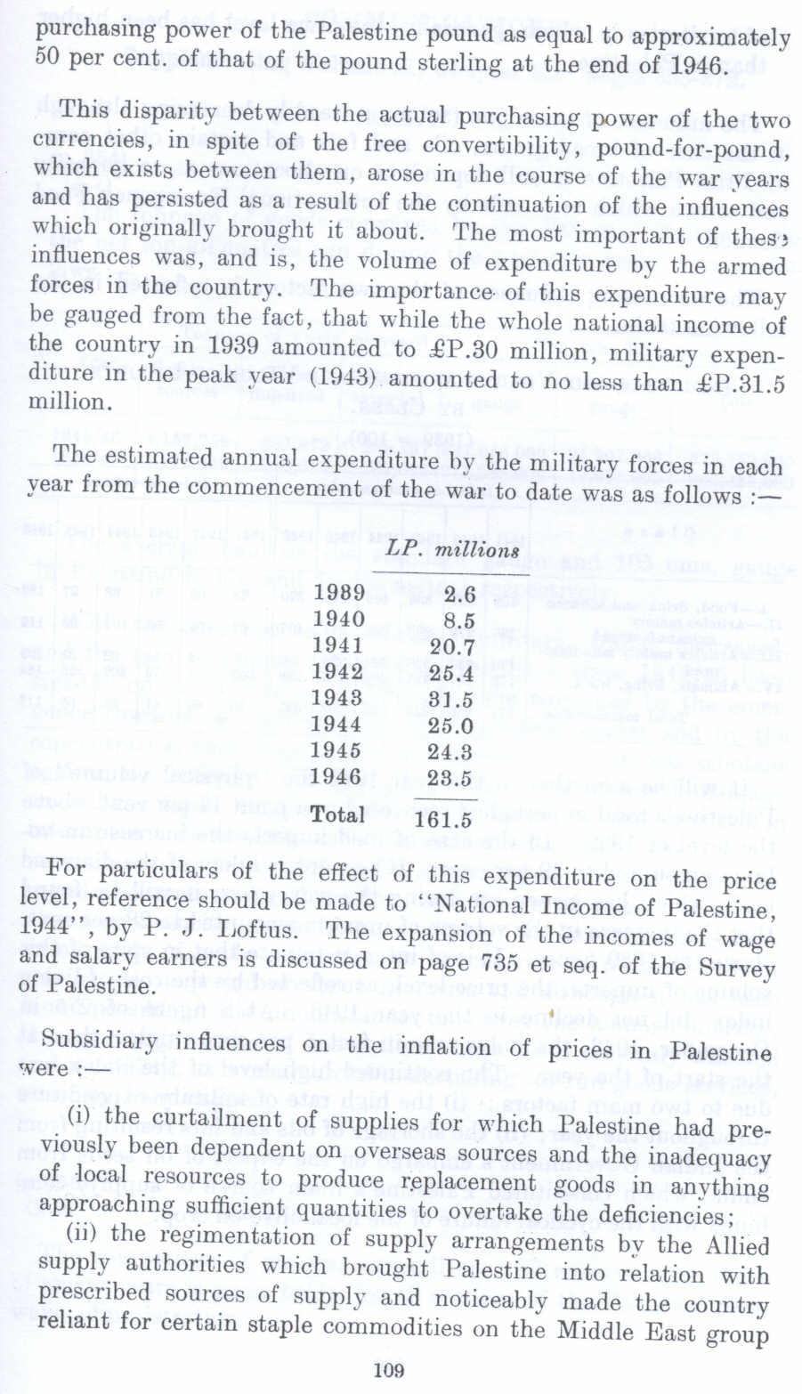 Total 161.5 For particulars of the effect of this expenditure on the price level, reference should be made to "National Income of Palestine, 1944", by P . .J. Loftus. The expansion of the incomes of wage and salary earners is discussed on page 735 et seq. of the Survey of Palestine.