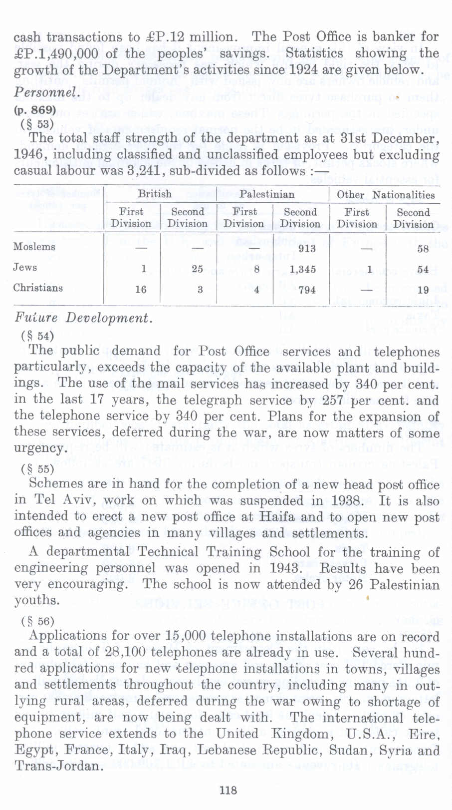 Schemes are in hand for the completion of a new head pose office in Tel Aviv, work on which was suspended in 1938. It is also intended to erect a new post office at Haifa and to open new post offices and agencies in many villages and settlements.
