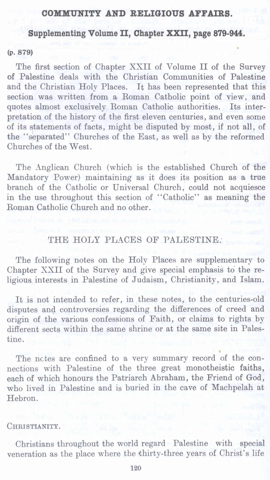 The first section of Chapter XXII of Volume II of the Survey of Palestine deals with the Christian Communities of Palestine and the Christian Holy Places. It has been represented that this section was written from a Roman Catholic point of view. and quotes almost exclusively Roman Catholic authorities. Its interpretation of the history of the first eleven centuries, and even some of its statements of facts, might be disputed by most, if not all, of the "separated" Churches of the East, as well as by the reformed Churches of the West.