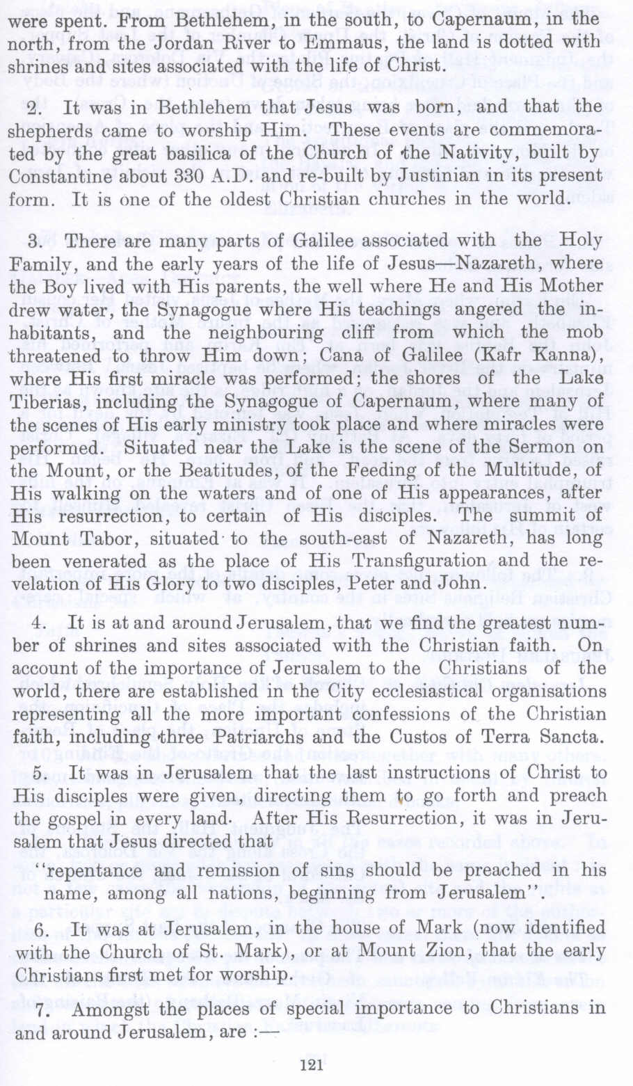 4. It is at and around Jerusalem, that we find the greatest number of shrines and sites associated with the Christian faith. On account of the importance of Jerusalem to the Christians of the world, there are established in the City ecclesiastical organisations representing all the more important confessions of the Christian faith, including three Patriarchs and the Custos of Terra Sancta.
