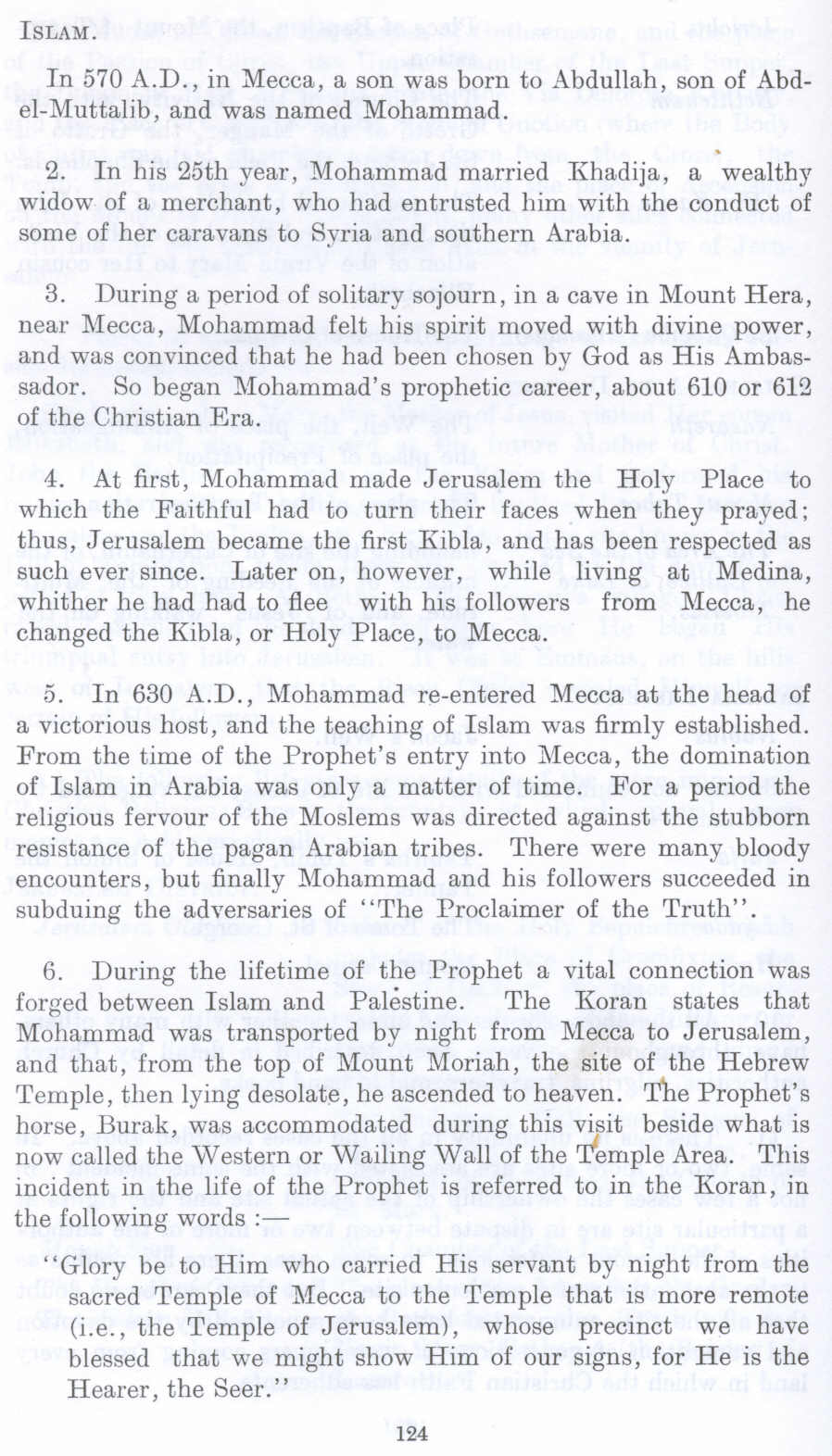 6. During the lifetime of the Prophet a vital connection was forged between Islam and Palestine. The Koran states that Mohammad was transported by night from Mecca to Jerusalem, and that, from the top of Mount Moriah, the site of the Hebrew Temple, then lying desolate, he ascended to heaven. The Prophet's horse, Burak, was accommodated during this visit beside what is now called the 'Western or Wailing Wall of the Temple Area. This incident in the life of the Prophet is referred to in the Koran, in the following words :-