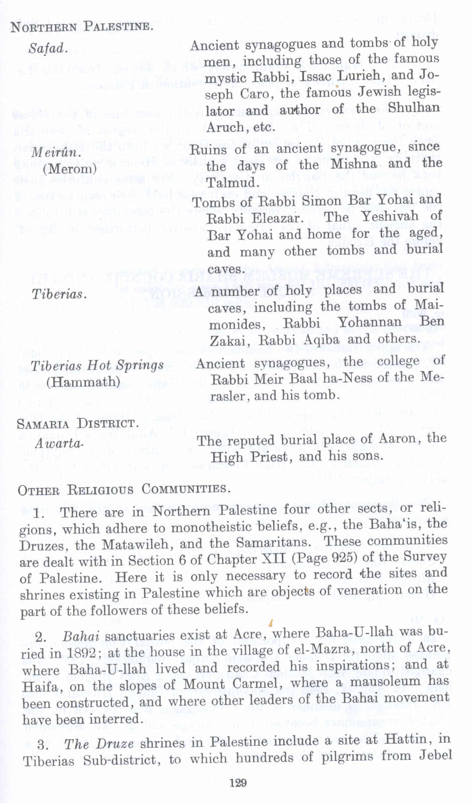 1. There are in Northern Palestine four other sects, or religions, which adhere to monotheistic beliefs, e.g., the Bahais , the Druzes, the Matawileh, and the Samaritans. These communities are dealt with in Section 6 of Chapter XII (Page 925) of the Survey of Palestine. Here it is only necessary to record the sites and shrines existing in Palestine which are objects of veneration on the part of the followers of these beliefs.