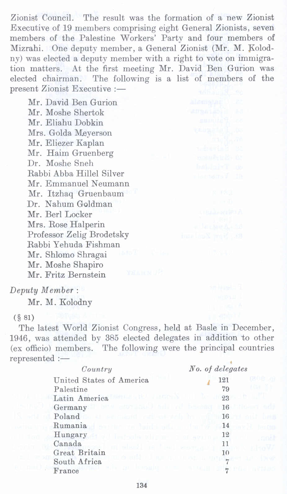The latest World Zionist Congress, held at Basie in December, 1946, was attended by 385 elected delegates in addition to other (ex officio) members. The following were the principal countries represented :-