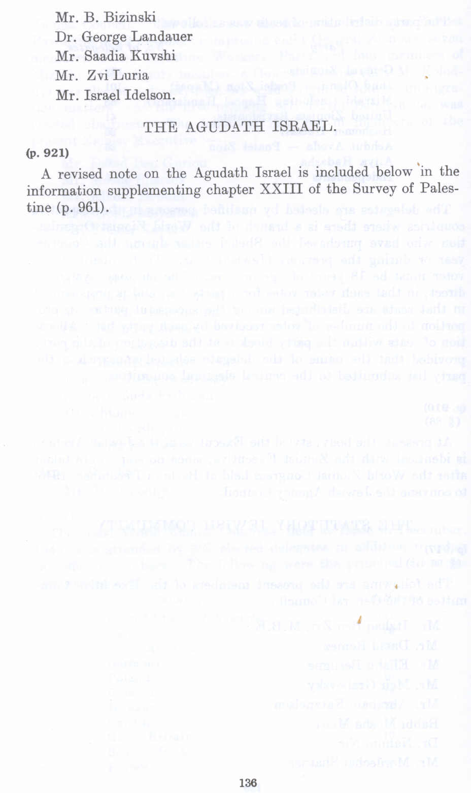 A revised note on the Agudath Israel is included below 'in the information supplementing chapter XXIIIof the Survey of Palestine (p. 961).
