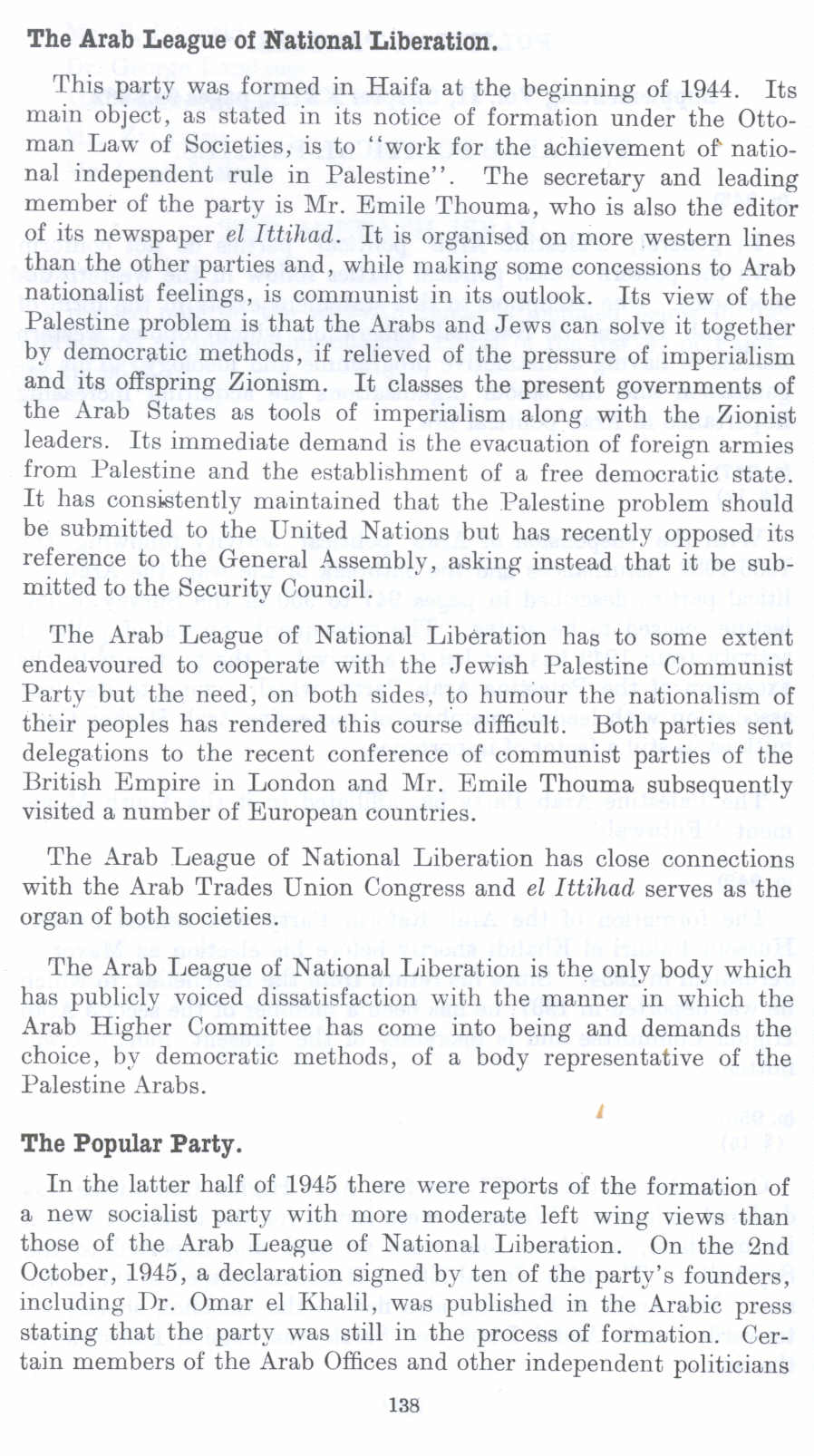 This party was formed in Haifa at the beginning of 1944. Its main object, as stated in its notice of formation under the Ottoman Law of Societies, is to "work for the achievement of national independent rule in Palestine''. The secretary and leading member of the party is Mr. Emile Thouma, who is also the editor of its newspaper el Ittihad. It is organised on more western lines than the other parties and, while making some concessions to Arab nationalist feelings, is communist in its outlook. Its view of the Palestine problem is that the Arabs and Jews can solve it together by democratic methods, if relieved of the pressure of imperialism and its offspring Zionism. It classes the present governments of the Arab States as tools of imperialism along with the Zionist leaders. Its immediate demand is the evacuation of foreign armies from Palestine and the establishment of a free democratic state. It has consistently maintained that the Palestine problem should be submitted to the United Nations but has recently opposed its reference to the General Assembly, asking instead that it be submitted to the Security Council.
