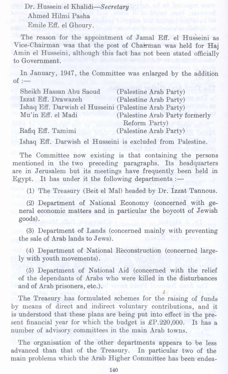(1) The Treasury (Beitel Mal) headed by Dr. Izzat Tannous. (2) Department of National Economy (concerned with general economic matters and in particular the boycott of Jewish goods).