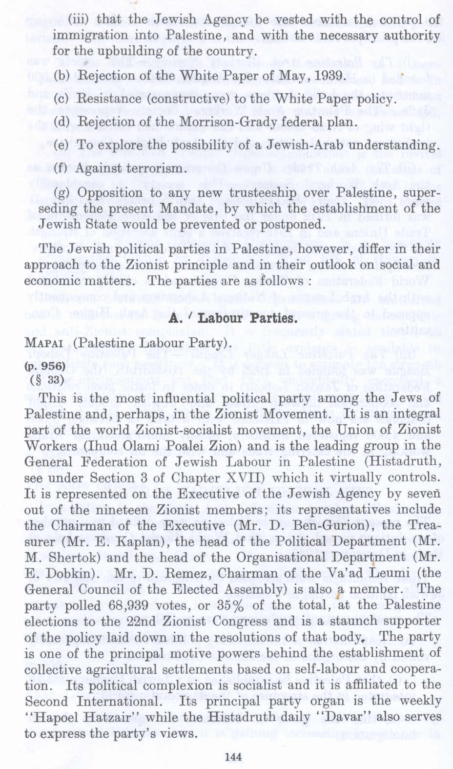 This is the most influential political party among the Jews of Palestine and, perhaps, in the Zionist Movement. It is an integral part of the world Zionist-socialist movement, the Union of Zionist Workers (Ihud Olami Poalei Zion) and is the leading group in the General Federation of Jewish Labour in Palestine (Histadruth , see under Section 3 of Chapter XVII) which it virtually controls. It is represented on the Executive of the Jewish Agency by seven out of the nineteen Zionist members; its representatives include the Chairman of the Executive (Mr. D. Ben-Gurion), the Treasurer (Mr. E. Kaplan), the head of the Political Department (Mr. M. Shertok) and the bead of the Organisational Department (Mr. E. Dobkin). Mr. D. Remez, Chairman of the Va'ad Leumi (the General Council of the Elected Assembly) is also i" member. The party polled 68,939 votes, or 35% of the total, at the Palestine elections to the 22nd Zionist Congress and is a staunch supporter of the policy laid down in the resolutions of that body. The party is one of the principal motive powers behind the establishment of collective agricultural settlements based on self-labour and cooperation. Its political complexion is socialist and it is affiliated to the Second International. Its principal party organ is the weekly "Hapoel Hatzair" while the Histadruth daily "Davar" also serves to express the party's views.