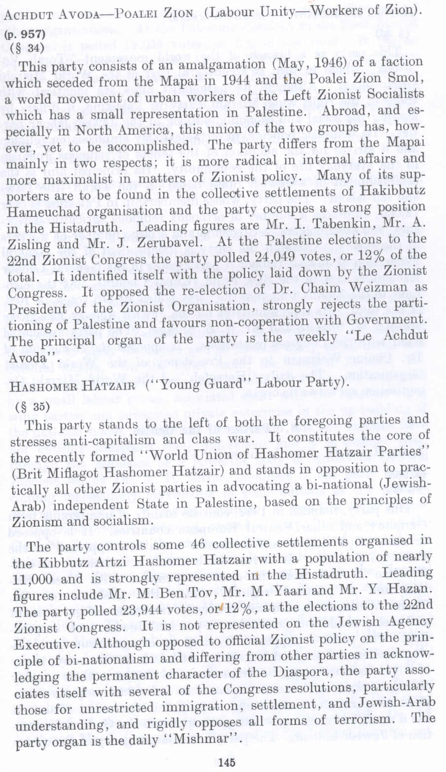 This party consists of an amalgamation (May, 1946) of a faction which seceded from the Mapui in 1944 and she Poalei Zion Smol, a world movement of urban workers of the Left Zionist Socialists which has a small representation in Palestine. Abroad, and especially in North America, this union of the two groups has, however, yet to be accomplished. The party differs from the Mapai mainly in two respects; it is more radical in internal affairs and more maximalist in matters of Zionist policy. Many of its supporters are to be found in the collective settlements of Hakibbutz Hameuchad organisation and the party occupies a strong position in the Ristadruth. Leading figures are Mr. I. Tabenkin , Mr. A. Zisling and Mr. J. Zerubavel. At the Palestine elections to the 22nd Zionist Congress the party polled 24,M9 votes, or 12% of the total. It identified itself with the policy laid down by the Zionist Congress. It opposed the re-election of Dr. Chaim Weizman as President of the Zionist Organisation, strongly rejects The partitioning of Palestine and favours non-cooperation with Government. The principal organ of the party is the weekly "Le Achdnt Avoda".
