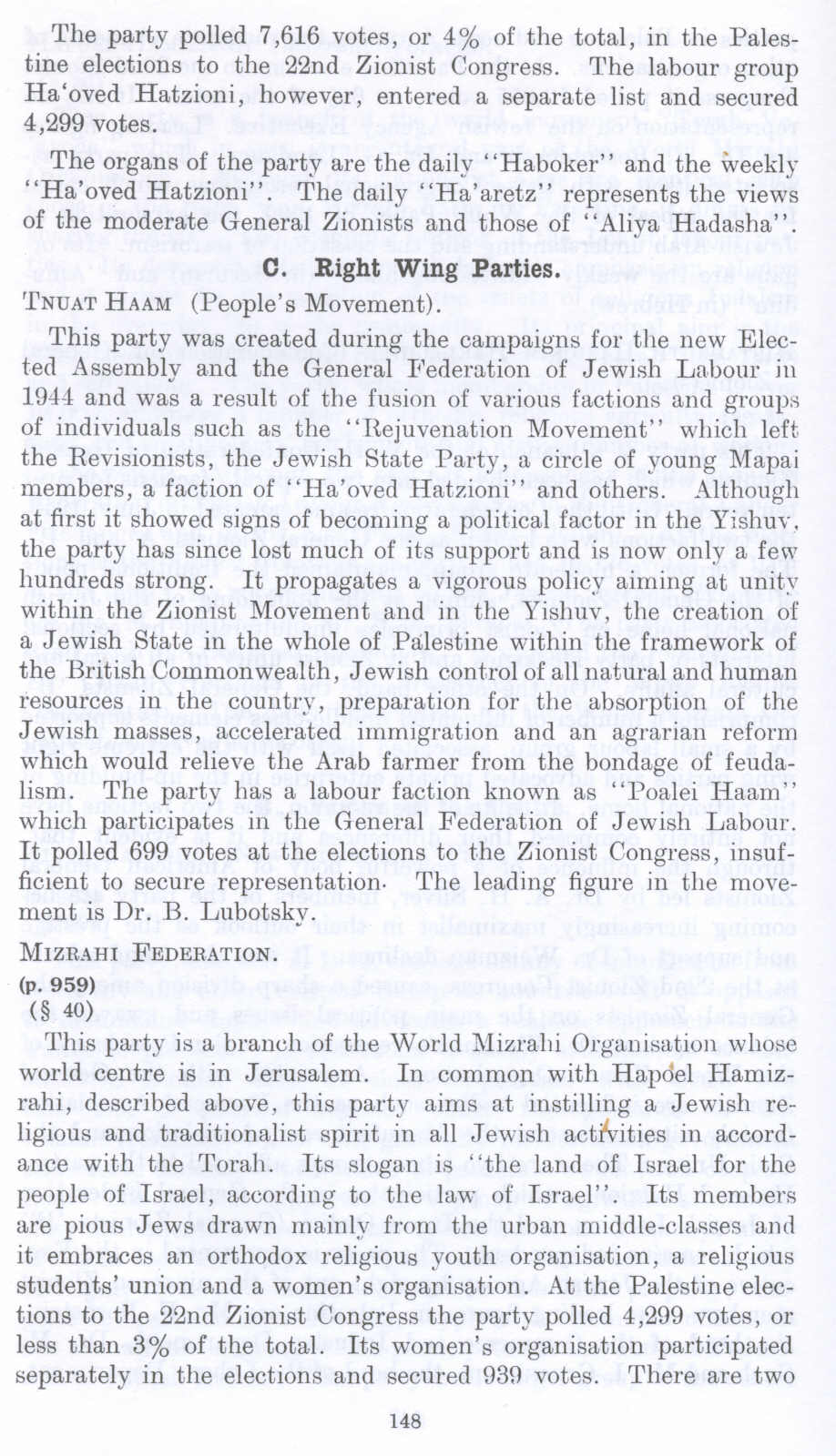This party is a branch of the World Mizrahi Organisation whose world centre is in Jerusalem. In common with Hapdel Hamizrahi , described above, this party aims at instilling a Jewish religious and traditionalist spirit in all Jewish activities in accordance with the Torah. Its slogan is "the land of Israel for the people of Israel, according to the law of Israel". Its members are pious Jews drawn mainly from the urban middle-classes and it embraces an orthodox religious youth organisation, a religious students' union and a women's organisation. At the Palestine elections to the 22nd Zionist Congress the party polled 4,299 votes, or less than 3% of the total. Its women's organisation participated separately in the elections and secured 93n votes. There are two