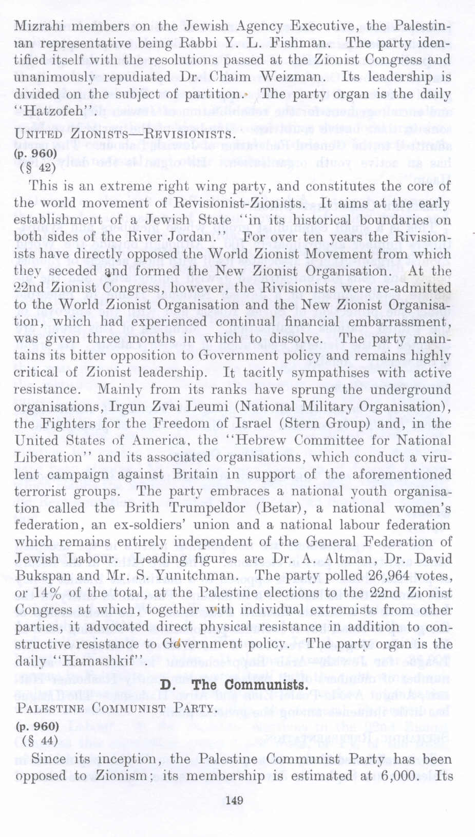 This is an extreme right wing party, and constitutes the core of the world movement of Revisionist-Zionists. It aims at the early establishment of a Jewish State "'in its historical boundaries on both sides of the River Jordan." For over ten years the Revisionists have directly opposed the World Zionist Movement from which they seceded and formed the New Zionist Organisation. At the Q2nd Zionist Congress, however, l.he Revisionists were re-admitted to the World Zionist Organisation and the New Zionist Organisation, which had experienced continual financial embarrassment, was given three months in which to dissolve. The party maintains its bitter opposition to Government policy and remains highly critical of Zionist leadership. It tacitlv sympathises with active resistance. Y!ainly from its ranks have sprung the underground organisations, lrgun Zvai Leumi (National Military Organisation), the Fighters for the Freedom of Israel (Stem Group) and, in the United Rtates of America. the "Hebrew Committee for National Liberation" and its associated organisations , which conduct a virulent campaign against Britain in support of the aforementioned terrorist groups. The party embraces a national youth organisation called the Brith Trumpeldor (Betar), a national women's federation, an ex-soldiers' union and a national labour federation which remains entirely independent of the General Federation of Jewish Labour. Leading figures are Dr. A. Altman, Dr. David Bukspan and Mr. S. Yuuitchman. The party polled 26,964 votes, or 1-1% of the total, at the Palestine elections to the 22nd Zionist Congress at which, together with individual extremists from other parties, it advocated direct physical resistance in addition to constructive resistance to G-dvernment policy. The party organ is the dailv "Hamashkif".