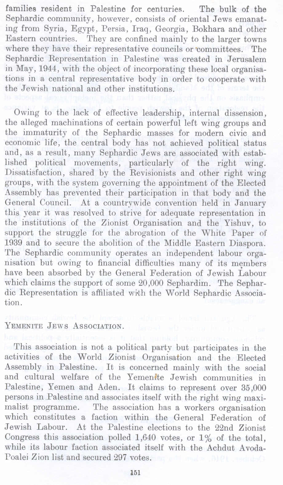 Owing to the lack of effective leadership, internal dissension, the alleged machinations of certain powerful left wing groups and the immaturity of the Sephardic masses for modern civic and economic life, the central body has not achieved political status and, as a result, many Sephardic Jews are associated with established political movements, particularly of the right wing. Dissatisfaction, shared by the Revisionists and other right wing groups, with the system governing the appointment of the Elected Assembly has prevented their participation in that body and the General Council. At a countrywide convention held in January this year it was resolved to strive for adequate representation in the institutions of the Zionist Organisation and the Yishuv, to support the struggle for the abrogation of the White Paper of 1939 and to secure the abolition of the Middle Eastern Diaspora. The Sephardic community operates an independent labour organisation but owing to financial difficulties many of its members have been absorbed by the General Federation of Jewish Labour which claims the support of some 20,000 Sepbardim. The Sephardic Representation is affiliated w-th the World Sephardic Association.