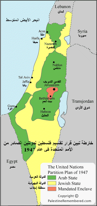 خرائط لفلسطين: خارطة تقسيم فلسطين لدولتين (عربية ويهودة صهيونية) بناءاً على قرار الأمم المتحدة 181 الصادر في 29 تشرين ثاني لعام 1947 |
