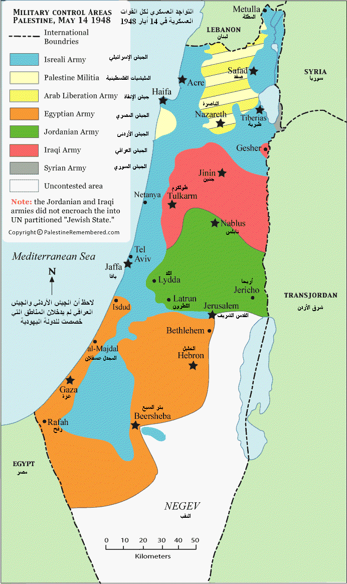 خرائط لفلسطين: التواجد العسكري لكل القوات العسكرية في فلسطين في 14 أيار 1948 |