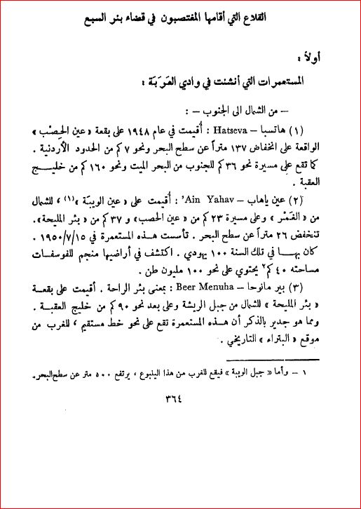 القلاع التي أقامها المغتصبون والمستعمرات التي أنشئت في وادي العربة و المستعمرات التي أنشئت في أراضي قبيلة العزازمة (قضاء بئر السبع) - بلادنا فلسطين، صفحة 364 |