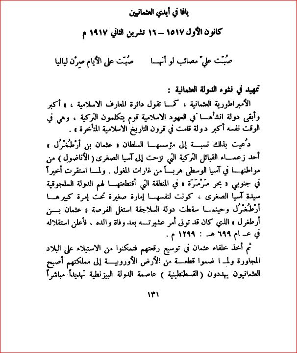 يافا في أيدي العثمانيين كانون الأول 1517 م - 16 تشرين الثاني 1917م - تمهيد في نشوء الدولة العثمانية - بلادنا فلسطين، صفحة 131 |
