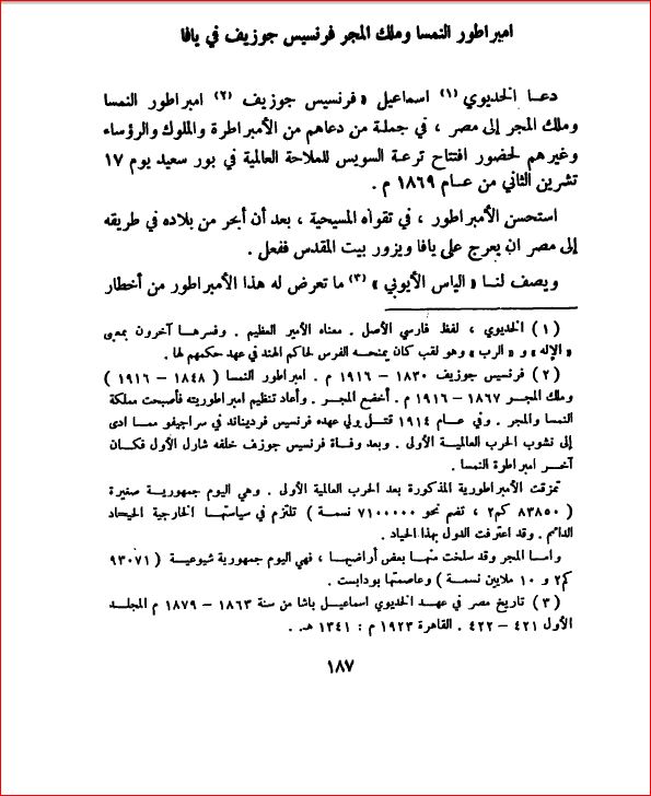 أمبرطور النمسا وملك المجر فرنسيس جوزيف في يافا - بلادنا فلسطين، صفحة 187 |