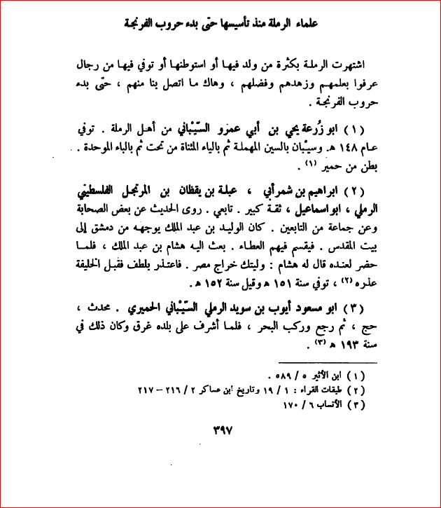 علماء الرملة منذ تأسيسها حتى بدء حروب الفرنجة - بلادنا فلسطين، صفحة 397 |
