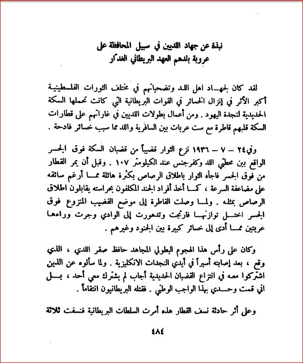 نبذة عن جهاد اللديين في سبيل المحافظة على عروبة بلدهم في العهد البريطاني الغدّار - بلادنا فلسطين، صفحة 484 |