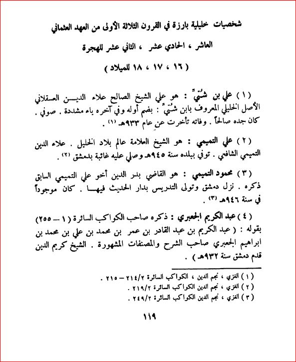 شخصيات خليلية بارزة في القون 16، 17 ، و 18 الميلادي - بلادنا فلسطين، صفحة 119 |