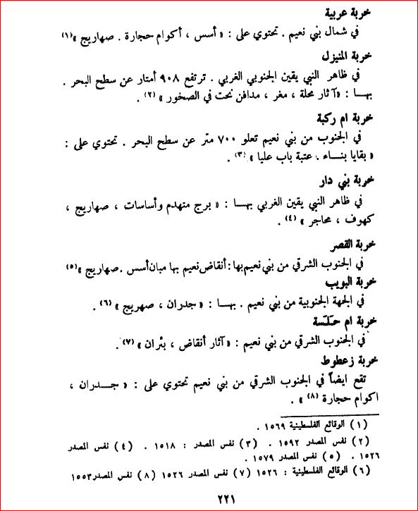 خربة عربية و خربة المنيزل وخربة ام ركبة وخربة بني دار وخربة صر وخربة البويب وخربة ام حلسة و خربة زعطوط، محافظة الخليل - بلادنا فلسطين، صفحة 221 |