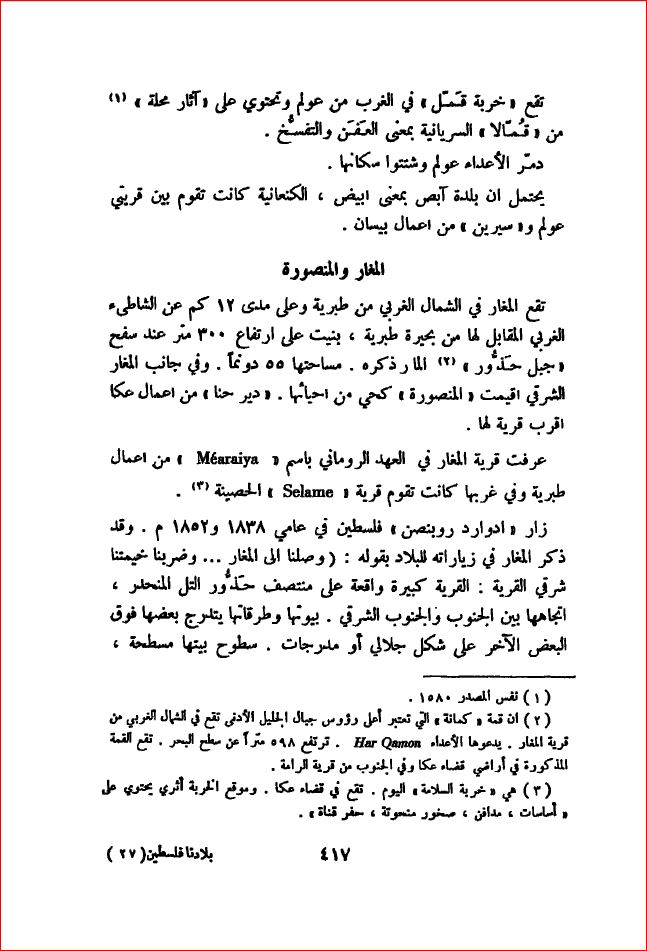 المغار والمنصور، محافظة طبرية - بلادنا فلسطين، صفحة 417 |