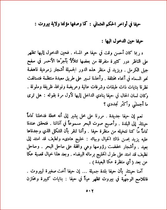 حيفا في أواخر العهد العثماني كما وصفها مؤلف ولاية بيروت - بلادنا فلسطين، صفحة 502 |