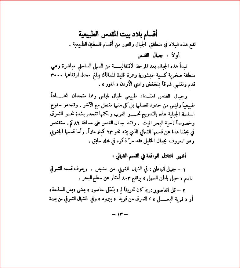 أقسام بلاد المقدس: أولا: جبال القدس، أشهر التلال الواقعة في الجزء الشمالي: جبل الباطن وتل العاصور - بلادنا فلسطين، صفحة 13 |