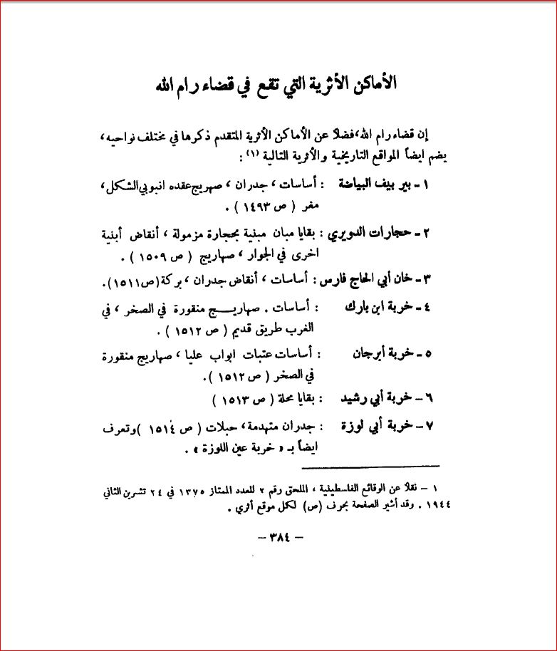 الأماكن الأثرية التي تقع فب قضاء رام الله - بلادنا فلسطين، صفحة 384 |