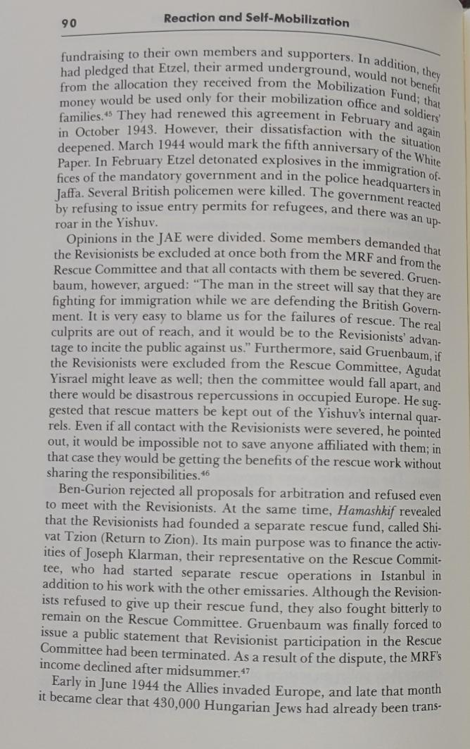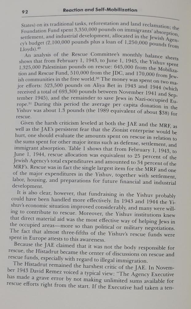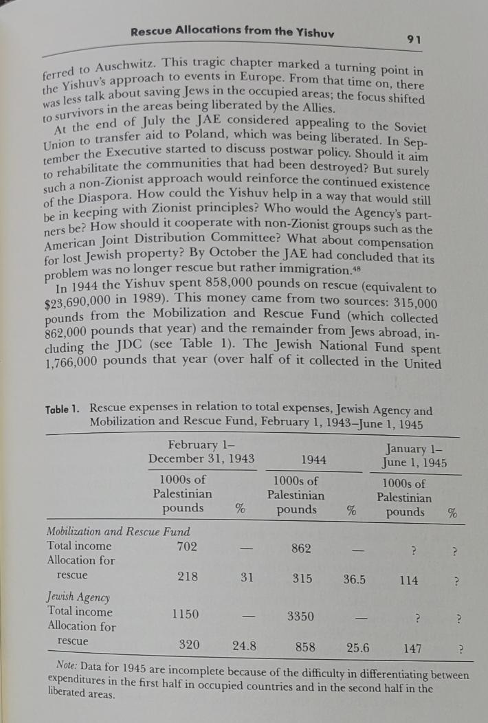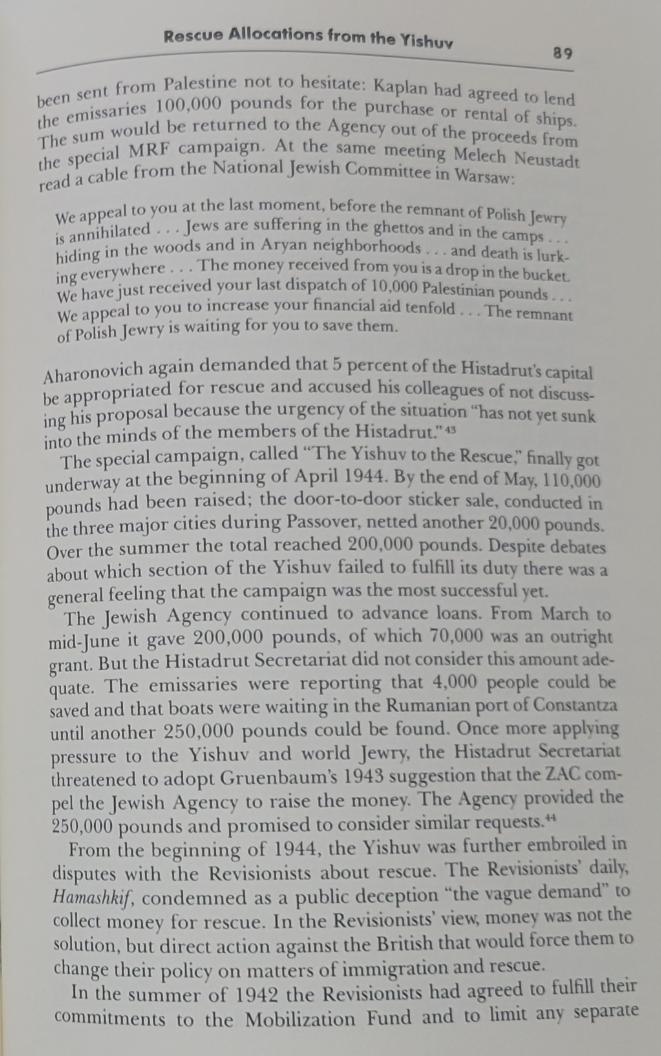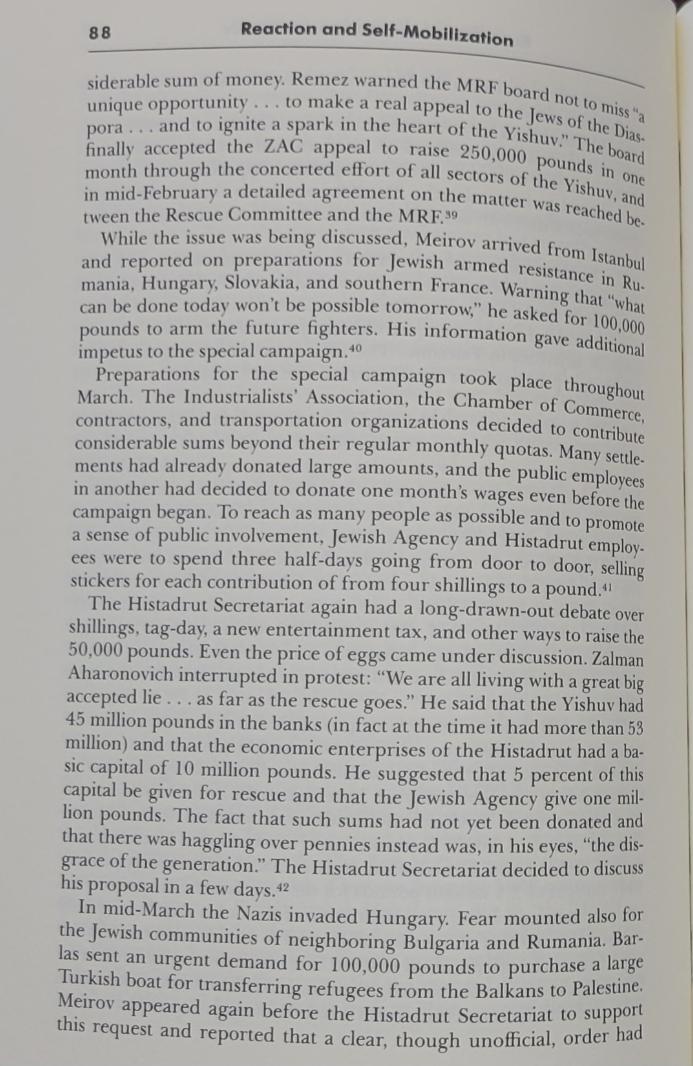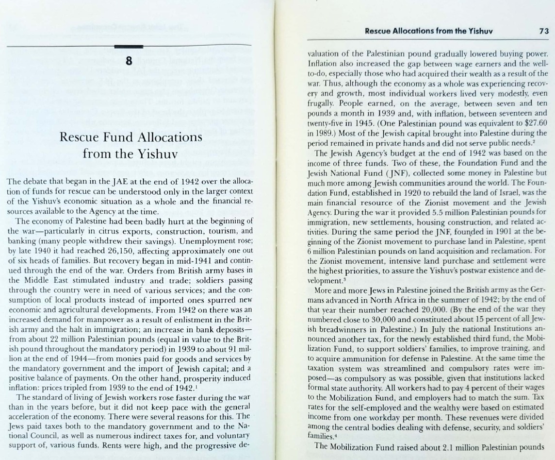 To put things into perspective, let us compare what was spent on rescuing Jews at the moment of crisis with the size of cash deposits and what was spent by three Zionists' enterprises on building the state to be:i) Palestine was awash with cash during WWII and all (Palestinians & Jews) made money where cash deposits almost quadrupled between 1939 & 1945 (Dina reported P£45 million in yishuv's saving accounts, p. 88 but the real number could be much larger), especially at the height of the calamity. ii) In total, almost P£12 million were spent during WWII by the two major funds (Foundation Fund and the JNF) plus P£2.1 by the Mobilization Fund (mostly funded from donations and an 8-9% tax on wages from yishuv employees & employers), and the vast majority wasn't spent on rescue but on building the state to be (i.e., buying lands, building kibbutzes, buying machinery, security, armaments, schools, healthcare, ..etc), and what was allocated (but not spent; i.e., expenditure) for rescue during the war (P£1.32 million allocated but onlyP£669k was spent on rescue, see Table 2, p. 104) was either funded from JA loans (that was paid later from donations) or outright donation from wealthy Jews abroad, i.e. JDC-- see Chapter 8 in Dina Porat's book, and focus on p. 72-73 for details.