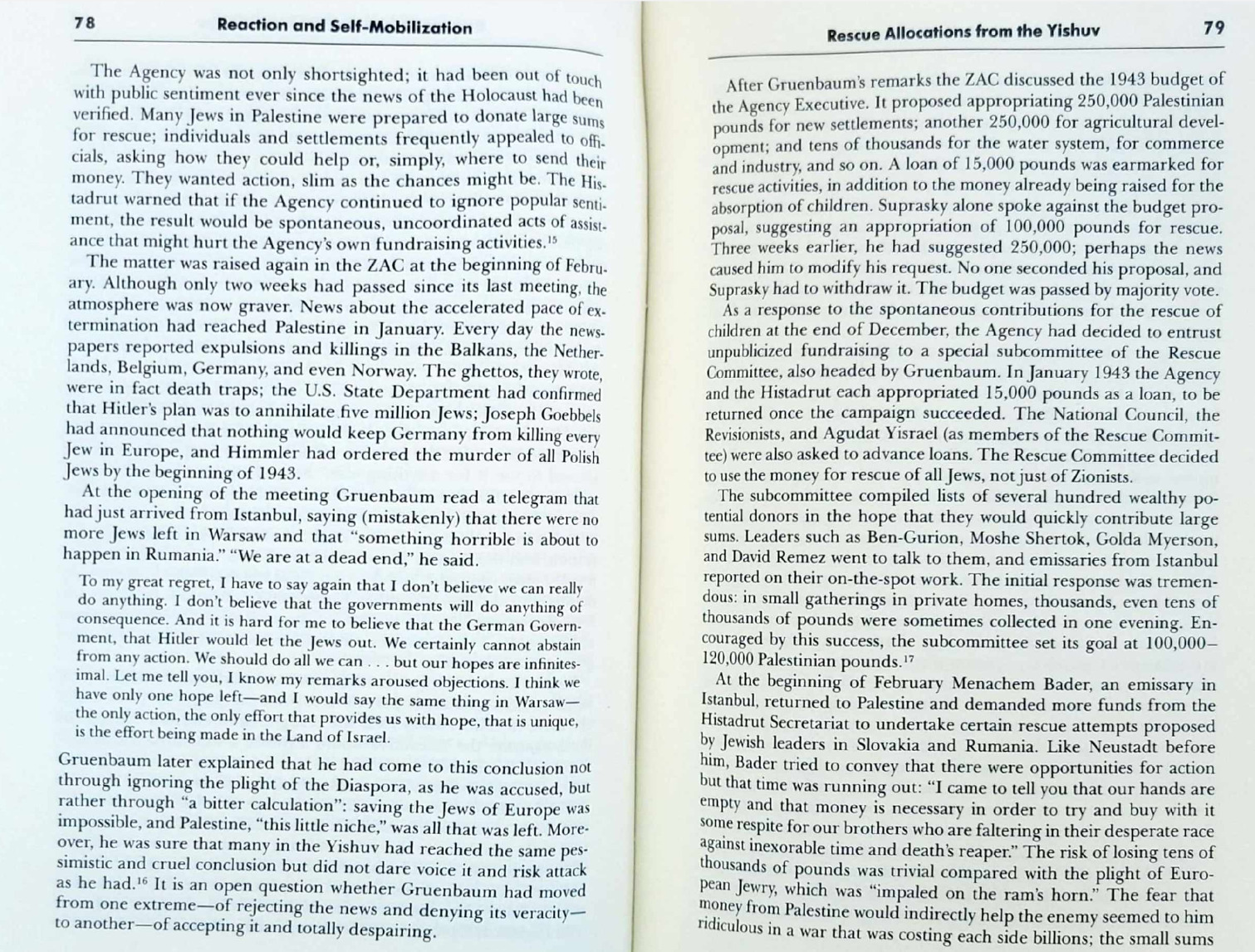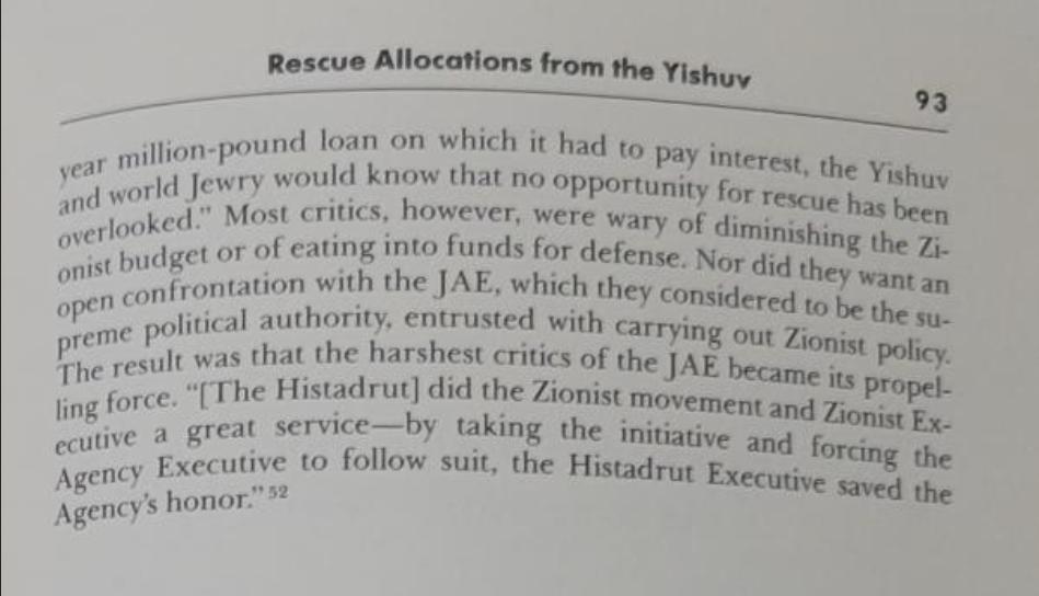 The yishuv in mass were in favor of increasing rescue funds, and it was the Histadrut that kept pushing over and over to help rescue Jews at a time of crisis. Still, it was the Zionist leaders (who headed the JAE) who resisted all calls to increase the budget allocated for rescue; see the ending of page 92-93 below.