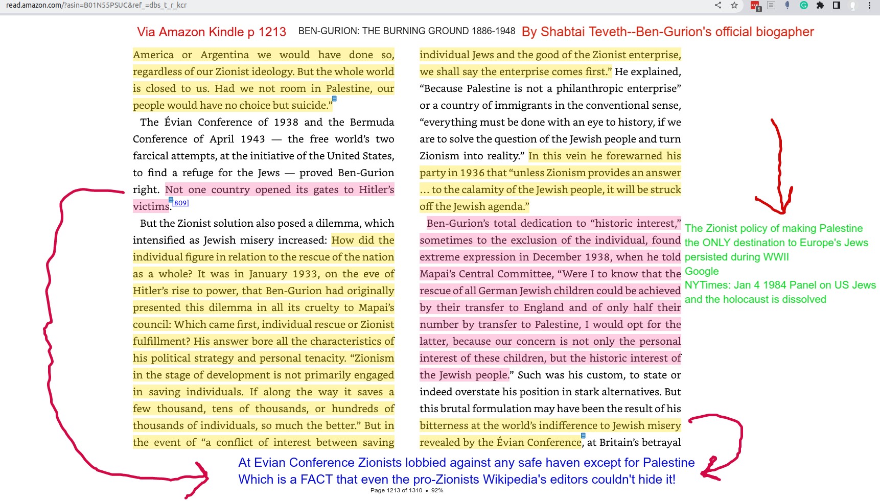 Shabtai Teveth (David Ben-Gurion official biographer) in "The Burning Ground 1888-1948" went out of his way to concoct excuses for David Ben-Gurion antisemitism by claiming not one country opened its gates to Jewish refugees after the Evian Conference, and painted Palestine as the only viable and available haven for Jews. Based on our extensive research, we found that actually many countries at the Evian Conference wanted to receive Europe's Jews, and it was Zionists groups (especially those who are based in the US) lobbied to frustrate their efforts. Pay attention to how Dan Kurzman (one of Ben-Gurion's official biographers who was cited by the NYTimes in July 1987) and pro-Zionist Wikipedia editor destroyed this big lie; keep scrolling for the details. Our analysis continues below the image.
