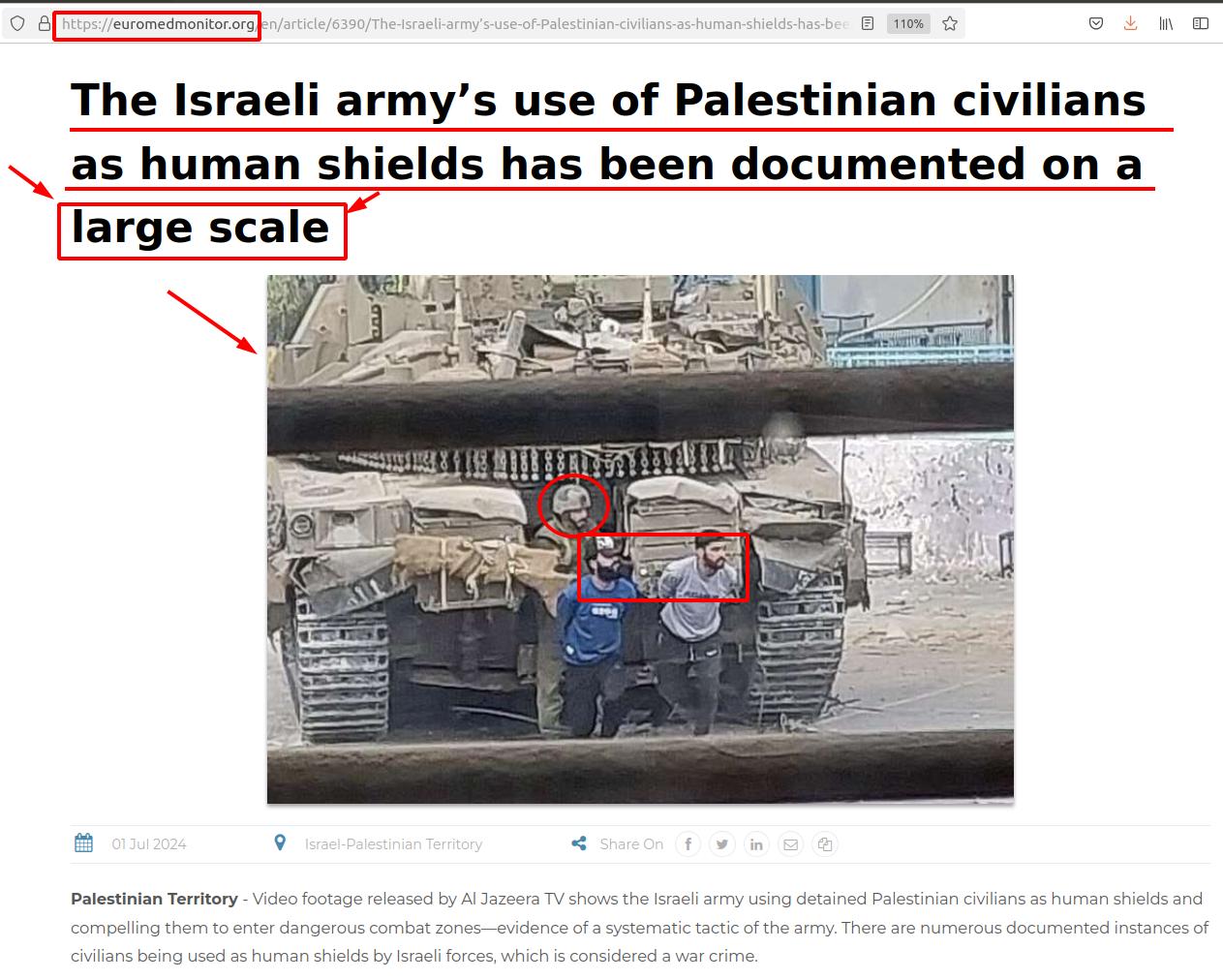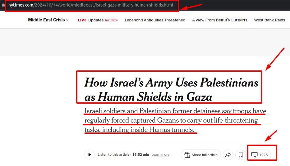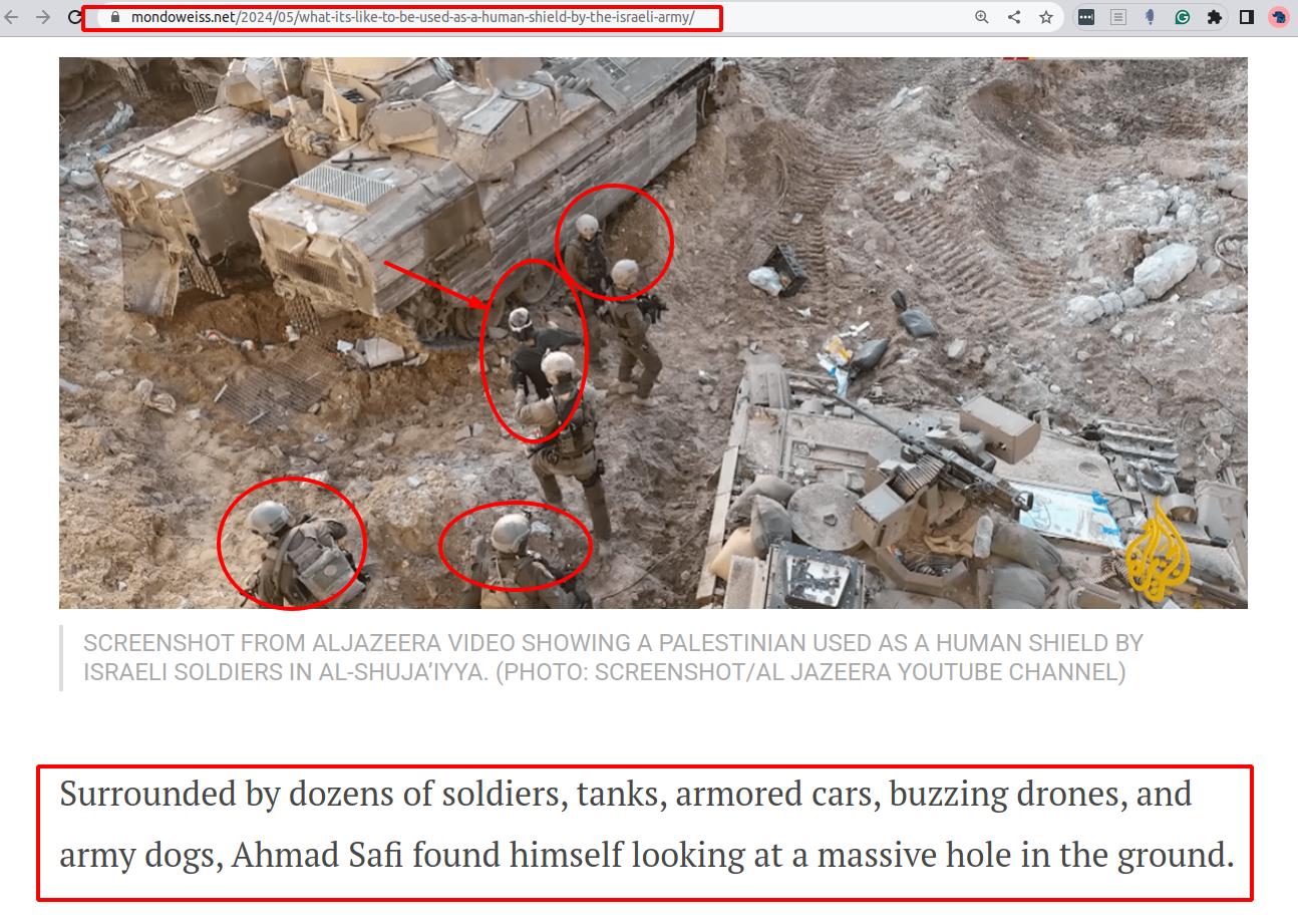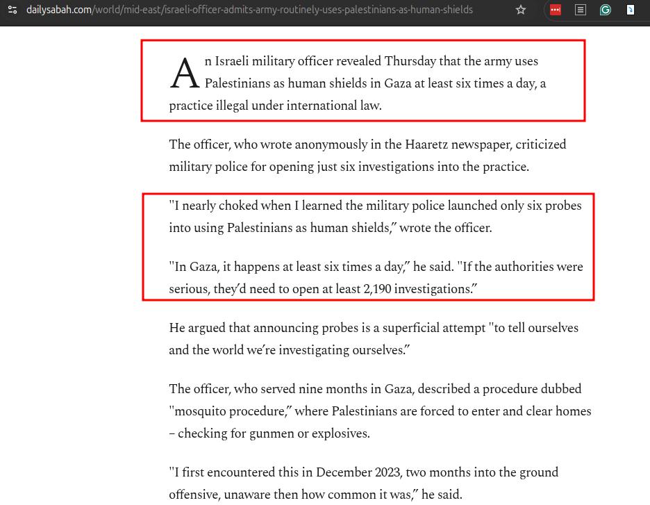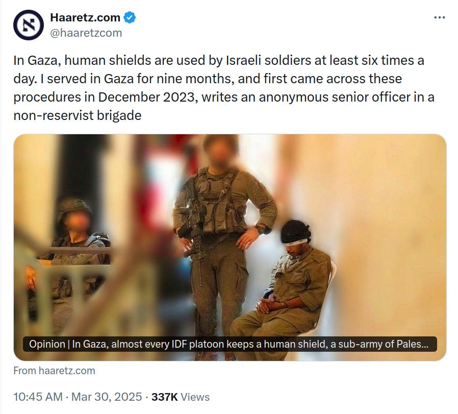 You will never read such a news from Western mainstream press like the BBC or the NY Times: "In Gaza, human shields are used by Israeli soldiers at least six times a day. I served in Gaza for nine months, and first came across these procedures in December 2023, writes an anonymous senior officer in a non-reservist brigade. This is not news to Palestinians." A vast majority of Palestinians experienced or witnessed this treatment inflicted upon their close relations. Consider the implications of this widespread practice, carried out for decades by Israelis, while simultaneously accusing Palestinians of similar actions. This community relies on the dissemination of significant falsehoods: