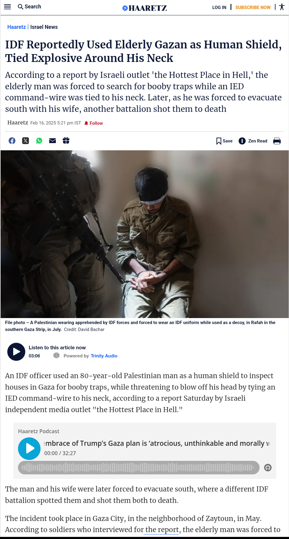- Ha'aretz: 'Human shield' dies as Hamas man is killed by troops
