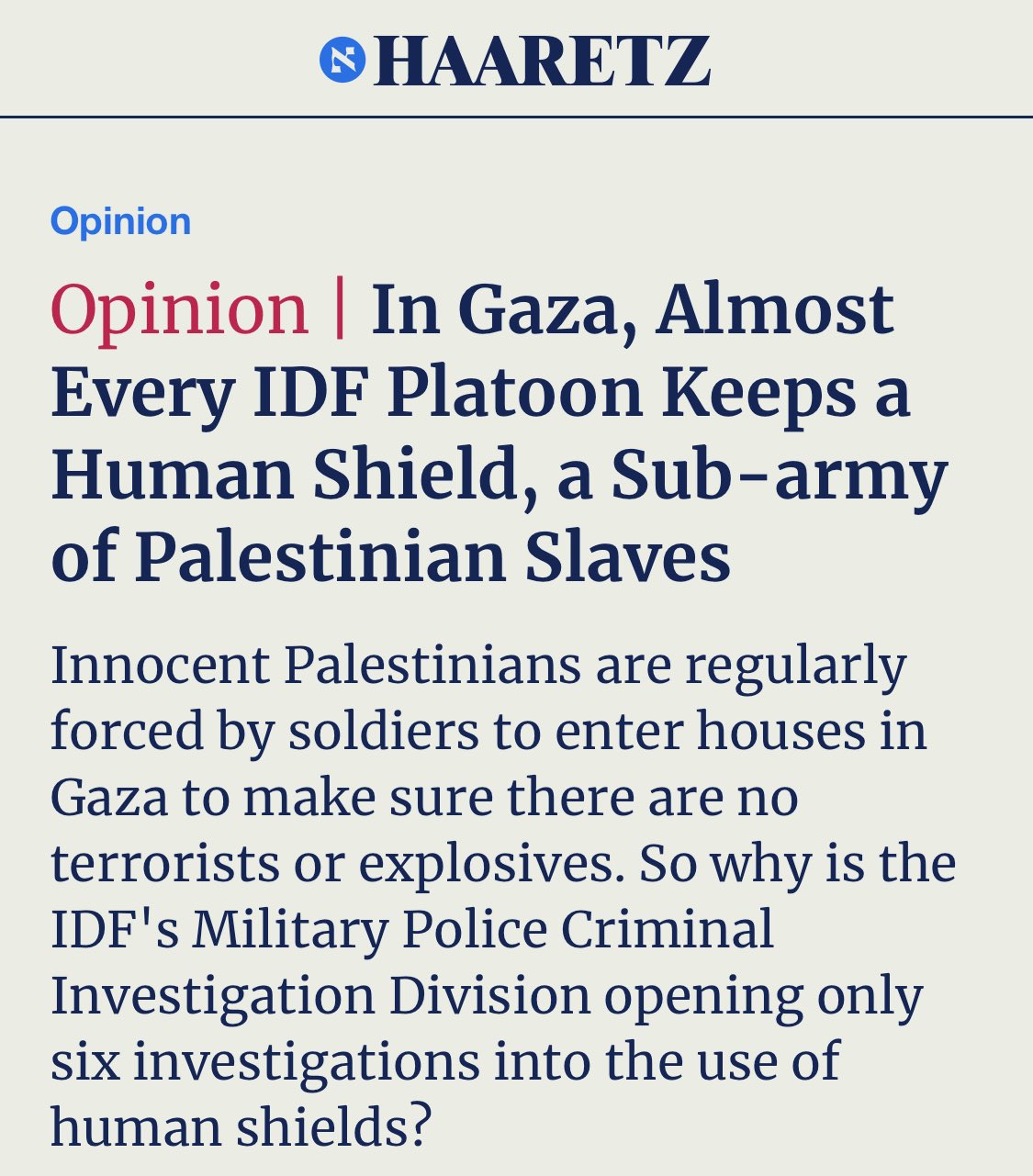 This 20-year-old says IDF used him as a human shield while searching houses in Gaza. He's not the only one who was forced to search sites for explosives; this is so common even before Oct. 7th. Here is the full article if you care: