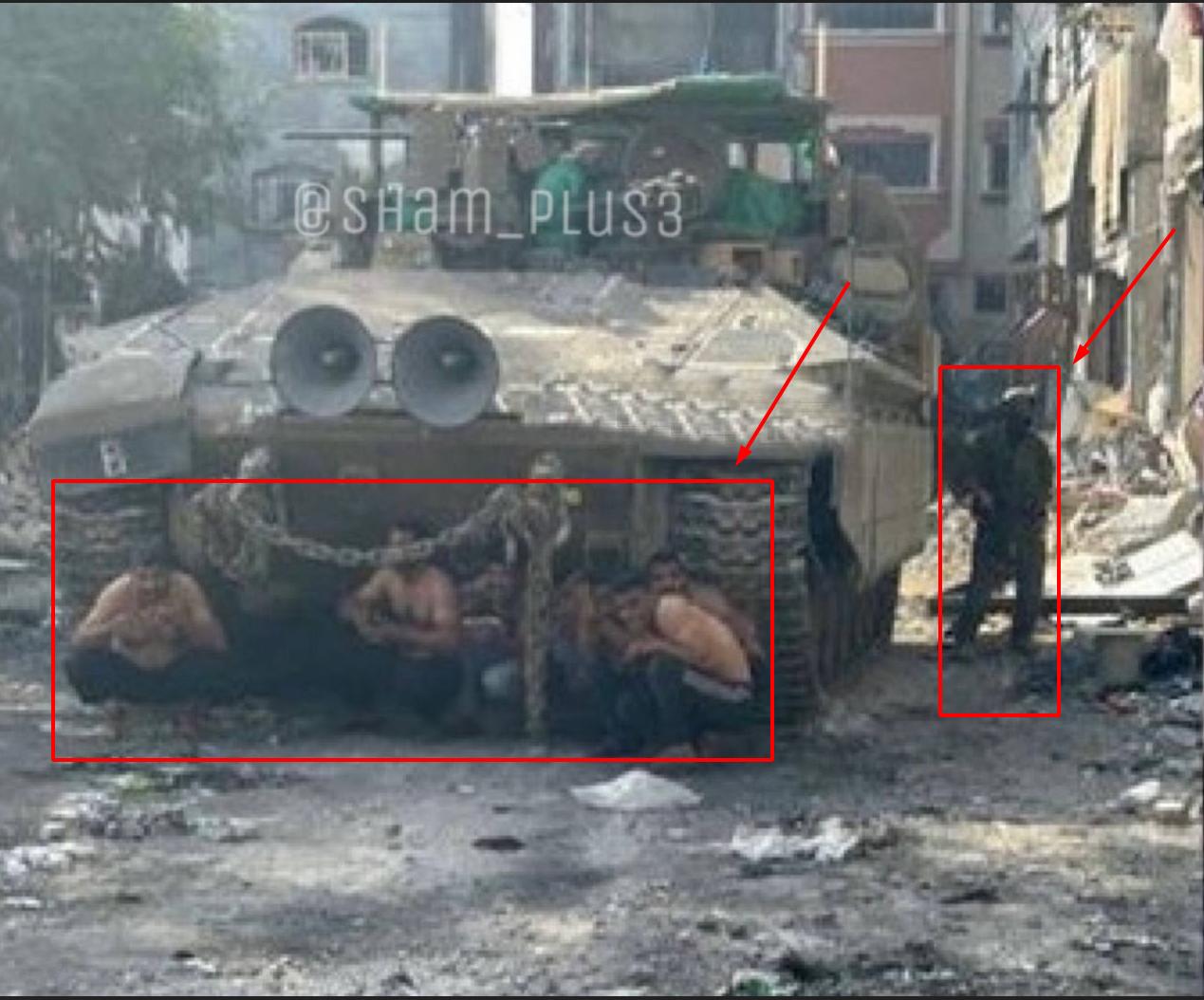 Here is the MOST MORAL ARMY station Palestinian civilians under their Merkava tank to protect themselves from attacks: