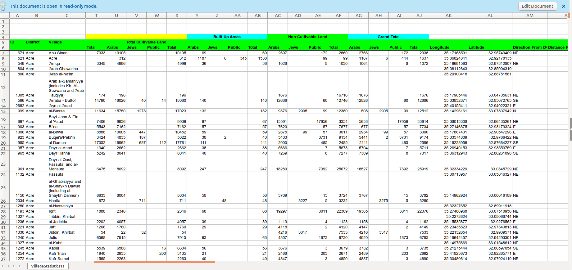 At PalestineRemembered.com, we have decided to open our the statistical database that we have collected so far for the general public and made it available in one spreadsheet. This important project was first motivated by Village Statistics of 1945 (which was published by the Palestine Government for the Anglo-American Commission of Inquiry in 1946) which collected statistical data about Palestine's villages (Palestinian and Jewish) as of 1945. We made them available a scanned version of this important book for the general public, click here for more details.