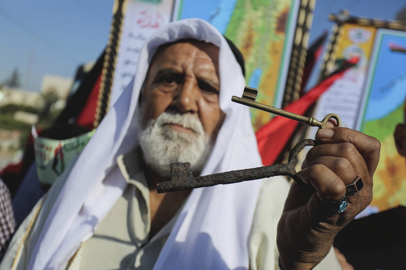 A Palestinian man holding a key during a demonstration against Israel's annexation plans in Gaza, July 2nd, 2020. Photo: Yousef Masoud/INA Photo Agency/Sipa USA via AP Images