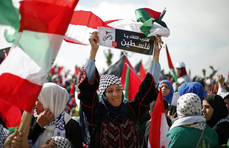 A Palestinian woman living in Lebanon holds a placard that reads, “We will meet soon Palestine, we will return,” during a rally to mark the 70th anniversary of the Nakba, May 15th, 2018. Photo: Bilal Hussein/AP Photo