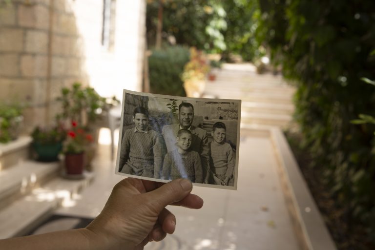 Samira Dajani holds a photo of her father, Fouad Moussa Dajani and his sons, taken in the same place in the courtyard of their home in the Sheikh Jarrah neighborhood of East Jerusalem, May 9th, 2021. The Dajanis are one of several Palestinian families facing imminent eviction in Sheikh Jarrah. Photo: Maya Alleruzzo/AP Photo