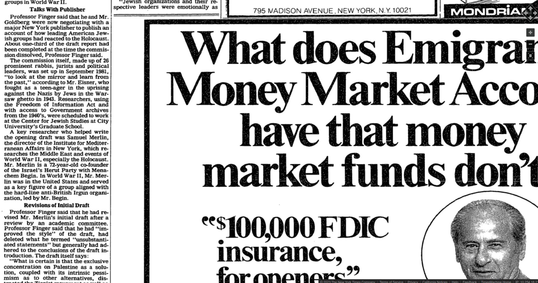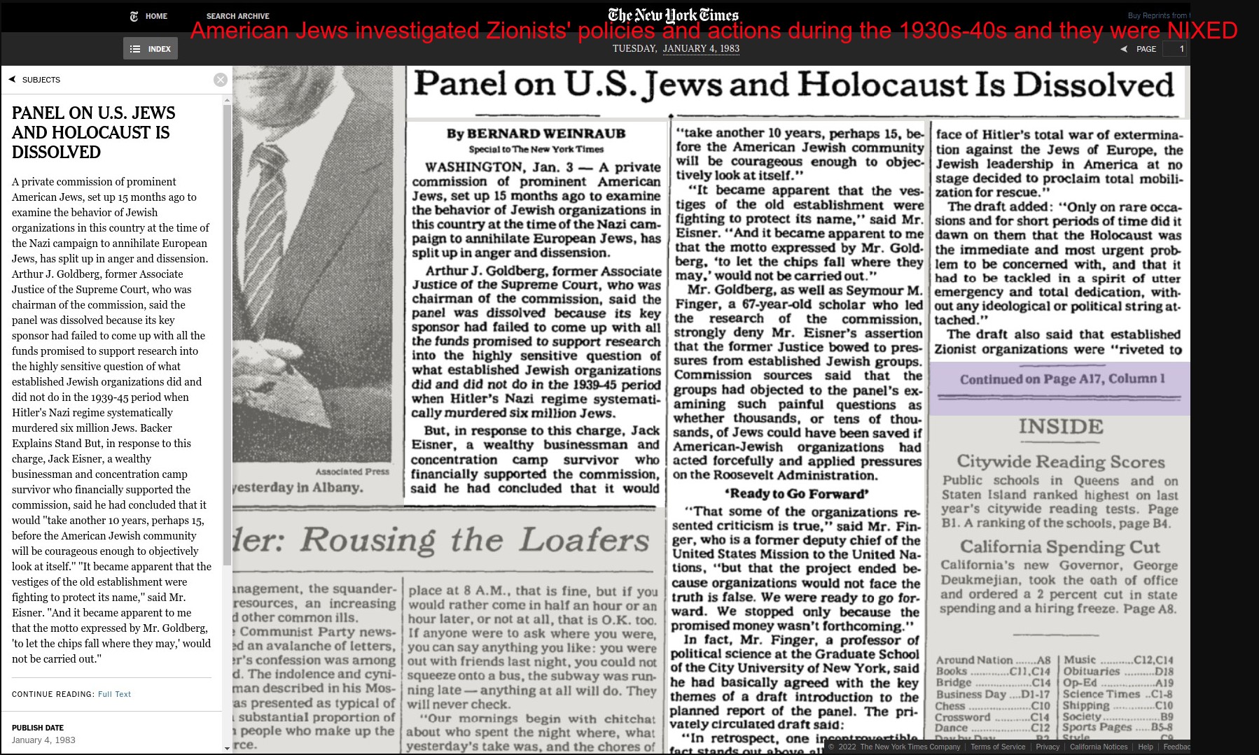 When this NY Times article came to our attention a few years ago, in early 2022, it became the primary driver behind researching the Facts About Haavara section. Single-handedly, what was disclosed, by pro-Zionist American Jews, in this report destroys much of the Zionists' narratives about the Holocaust, which often portrayed Zionists as the "protectors of Jewish honor" and who did everything possible to rescue Europe's Jews during WWII. As you read the article, please pay attention to what has been highlighted in black and red and to what was written between brackets in italics; we have inserted our notes for added context. In spite of defunding the investigation and nixing it mid-stream in early 1983, what was disclosed generated a big storm in the Jewish communities worldwide. Although very little was disclosed, a new commission had to be assembled quickly to water down the initial half-baked report (i.e., ironically, Palestine didn't even appear in the new report as it does in this draft). As you read this article, keep in mind this research paper by Berman Aaron (a renowned pro-Zionist Holocaust historian), Nahum Goldmann's autobiography, and this 1987 letter to the NY Times' editor are very relevant. To be fair to Zionists, we found two rebuttals for this investigation (from the Forward, which referenced a pro-Zionist Holocaust historian, Lucy S. Dawidowicz's rebuttal in June 1983). Still, both A) never addressed the main issue: why did American Jews FOCUS ONLY on Palestine as the haven for European Jews? B) why did American Jewry not demand opening America's doors to Europe's Jews? C) both rebuttals rarely addressed the cited facts and D) both primarily engaged in name-calling.