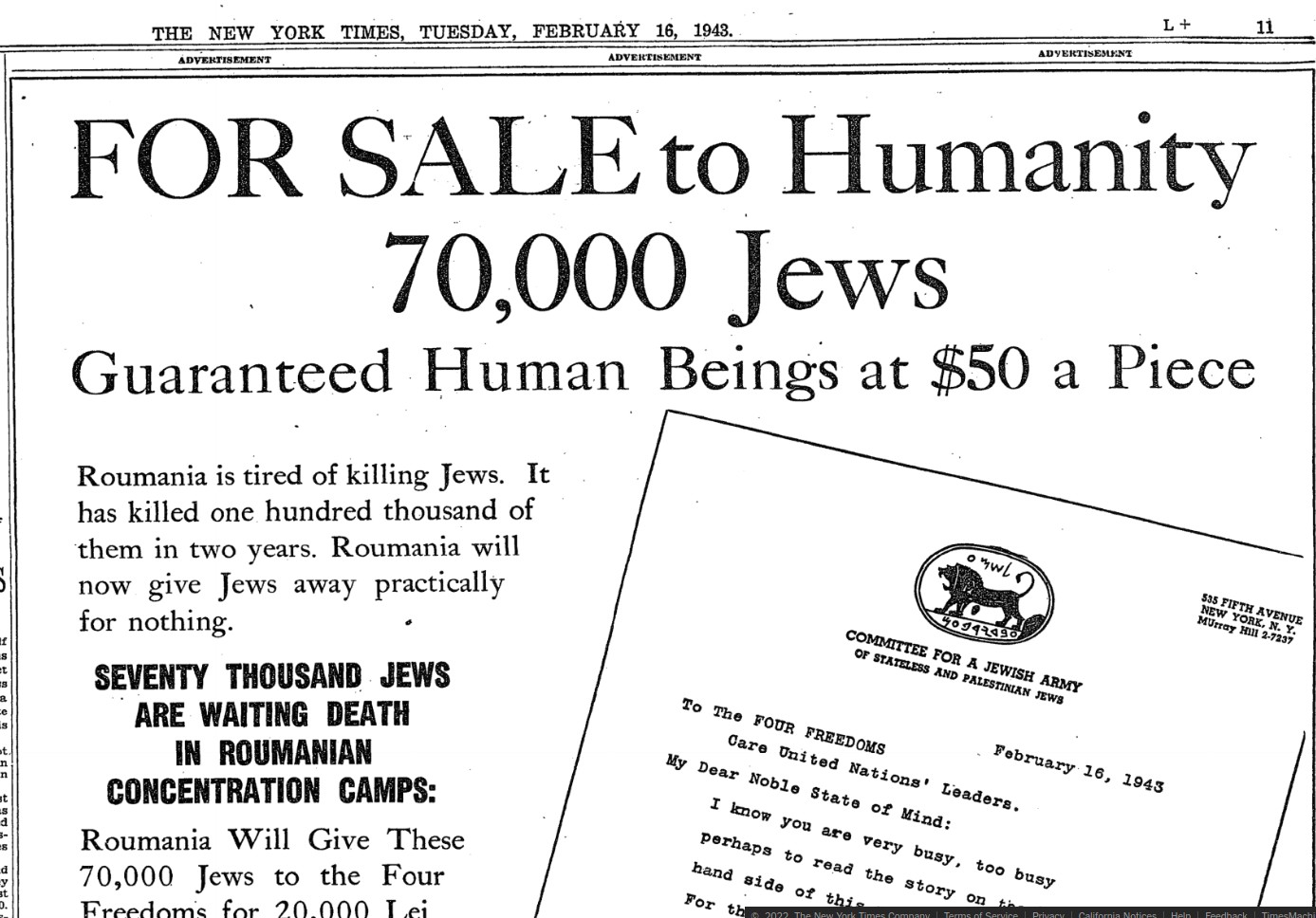 American Jews first learned of the Rumanian offer on Feb. 13, 1943, in a story in The New York Times from London. Chaim Weizmann, the head of the Zionist Organization, was visiting then in the United States. He called Morgenthau, who said he would talk to Roosevelt, with whom he was lunching that day. Roosevelt told Morgenthau to take it up with Welles. Jewish leaders also saw the British Ambassador, Lord Halifax, who promised to cable the Foreign Office to take all measures necessary to remove the Jews, if the offer was genuine. On Feb. 16, before the offer had been confirmed, the Irgunists ran a five-column advertisement in The New York Times:"FOR SALE to Humanity 70,000 Jews Guaranteed Human Beings at- $50 apiece."