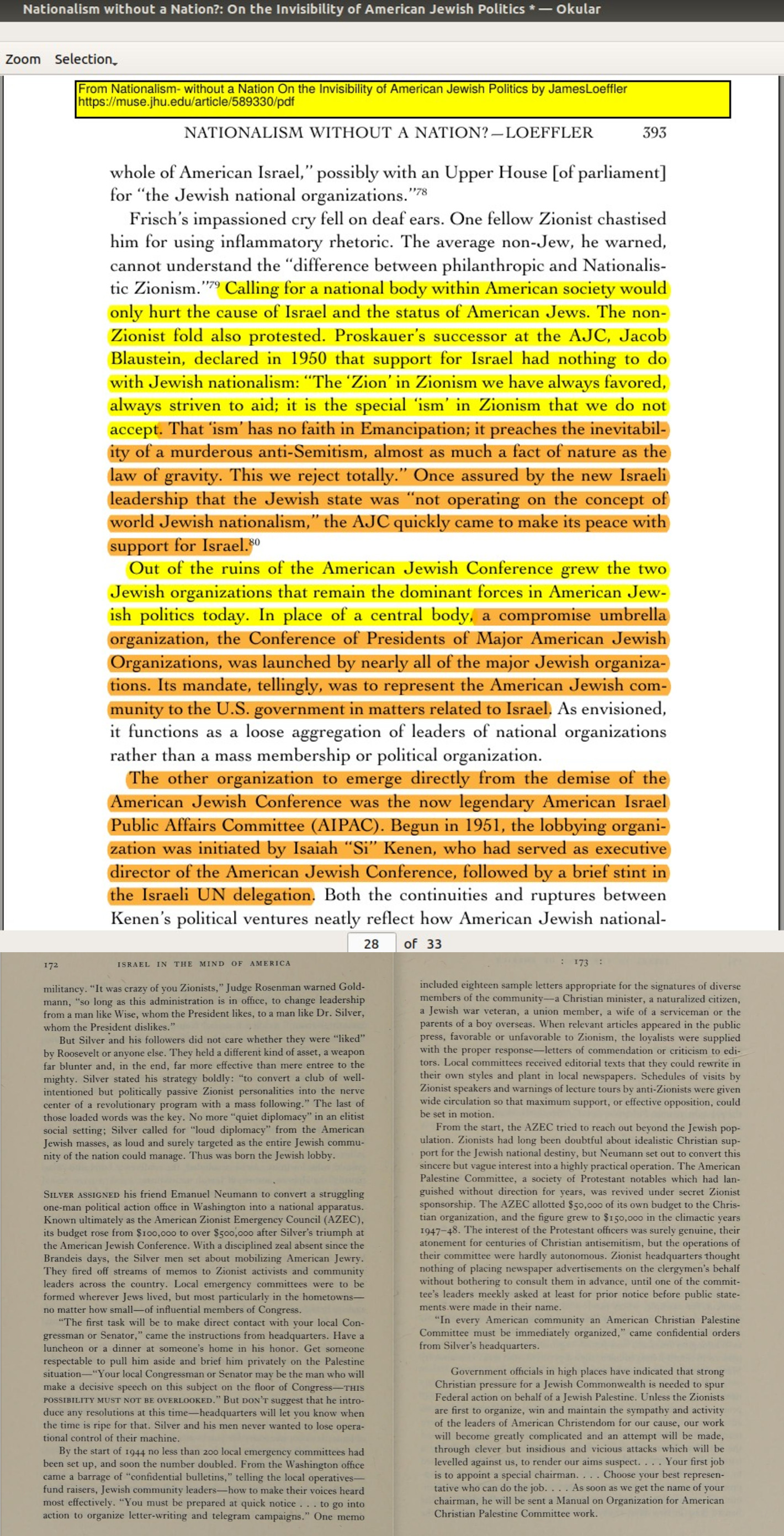 At the American Jewish Conference [the prelude to AIPAC] of 29 August 1943 [64 American Jewish groups, by far the largest Jewish voices at the time that was composed of 500 delegates representing some 2,250,000 Jews] the adoption of the Biltmore program was challenged by Joseph Proskauer and Robert Goldman, they argued that the immediate problem was the rescue effort, not the establishment of a Jewish commonwealth. Goldman felt the Biltmore program was unduly weighted in favour of the establishment of a Jewish commonwealth [in Palestine was implied] and that the focus on this as a priority would hamper the efforts to rescue the European Jewry.While Abba Silver [who was against bombing the death camps & railroads into them during the conference] and Emanuel Neumann put forward that the establishment of a Jewish commonwealth [in Palestine] should be the primary aim. [Image grab and if you are interested to read the boring details from the primary source "American Jewish Conference Report On The Interim Committee And Commissions On Rescue, Palestine And Post War", see pages 4-5, 12-13, 16-17, & 18-19]