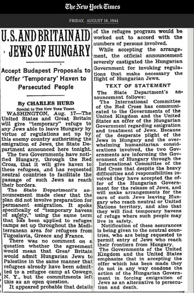 [Thus, to save the Jews, what is the big deal if a few million sacrificed at the altar! Didn't the Carthaginians sacrifice there babies? For the love of God guys, don't make a big deal out of it. Everyone does it, right? Now please, allow what Ben-Gurion said to sink in for a minute, then reflect: in the World of KAPOs; wasn't this the worst? - Dina Porat stated that the Jewish Agency appealed to Great Britain and the US to receive tens of thousands of Hungarian Jews as of July 20, 1944 (see p. 235-36). On the other hand, she cited no sources (which was very odd, she always cites). It seems such an appeal was heeded by the US & GB, who extended such an offer only as a temporary solution (see NYTimes, Aug 18th, 1944). That said, there was no response from the Jewish Agency whatsoever. The lack of citations in Dina's book leads us to believe that if such an offer existed, it must have been a temporary proposal until the war ended. Then, the Jewish refugees would be transferred to Palestine. In our opinion, even this scenario is highly unlikely because Aaron Berman stated that Zionist leaders were against receiving Jews in Palestine under the status of refugees (yes, Zionists wanted them to have full rights from day one), which was the case in early 1944 and in July 1944 (see The American Zionist Lobby, 1943-1945 by Aaron Berman p. 120-21, 144-45).
