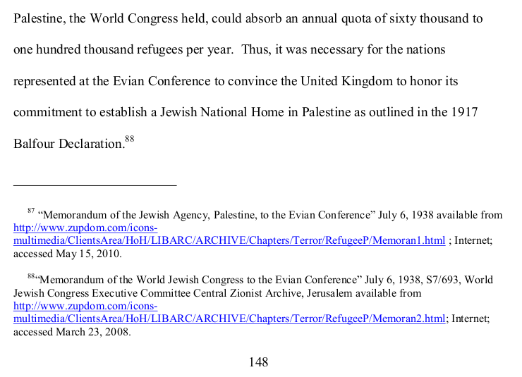 Palestine, the World [Jewish] Congress held, could absorb an annual quota of sixty thousand to one hundred thousand refugees per year. Thus, it was necessary for the nations represented at the Evian Conference to convince the United Kingdom to honor its commitment to establish a Jewish National Home in Palestine as outlined in the 1917 Balfour Declaration. (The Jewish Trail of Tears, p. 148)