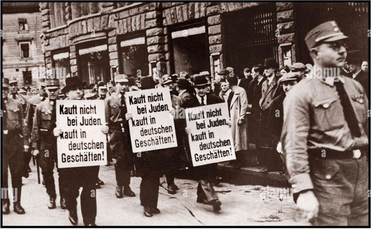 Haavara FAQs: 1930’s Three Jewish businessmen are paraded down Bruehl Strasse by uniformed Nazi NSDAP Brown Shirts in central Leipzig, carrying signs that read: Don't buy from Jews; Shop at German stores! Leipzig Germany |