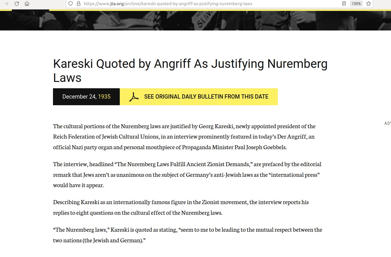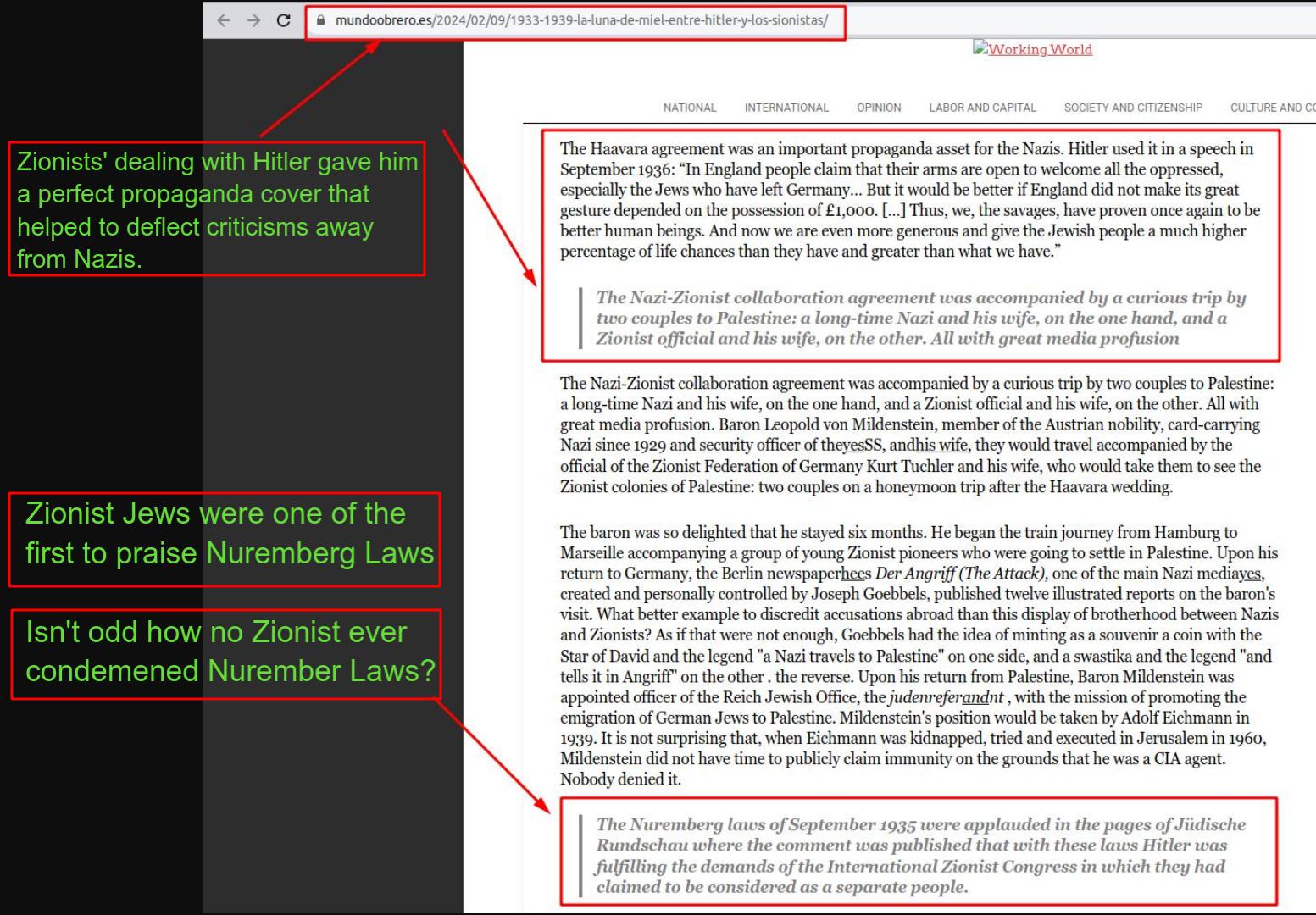 Here is an excellent short clip documenting how Nazis were fond of Zionists (here is the link on YouTube). Trust us, it will be worth your time; we vouch for its contents. At length, we have address this subject in couple of sections and sections here as well: