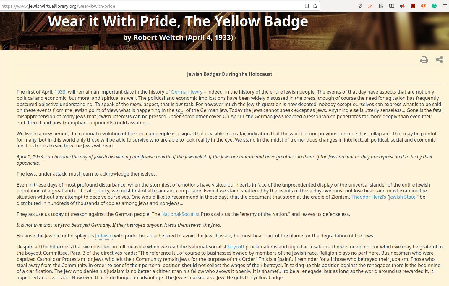 Nine years before the Nazis demanded that Jews should wear the yellow star of David to ease their identification, Zionist German Jews suggested it in April 1st, 1933. Mazeltov: