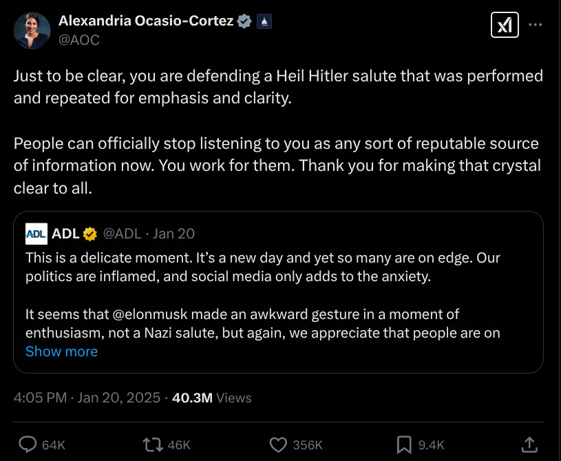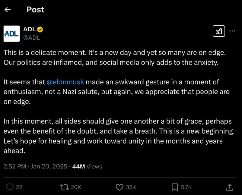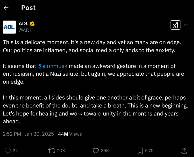 Here is Elon Musk's infamous salute, but that should be no surprise to most, right? Well, keep on scrolling. ADL gave him a free pass; that is how it works. Fascists always need someone to cleanse their reputation: